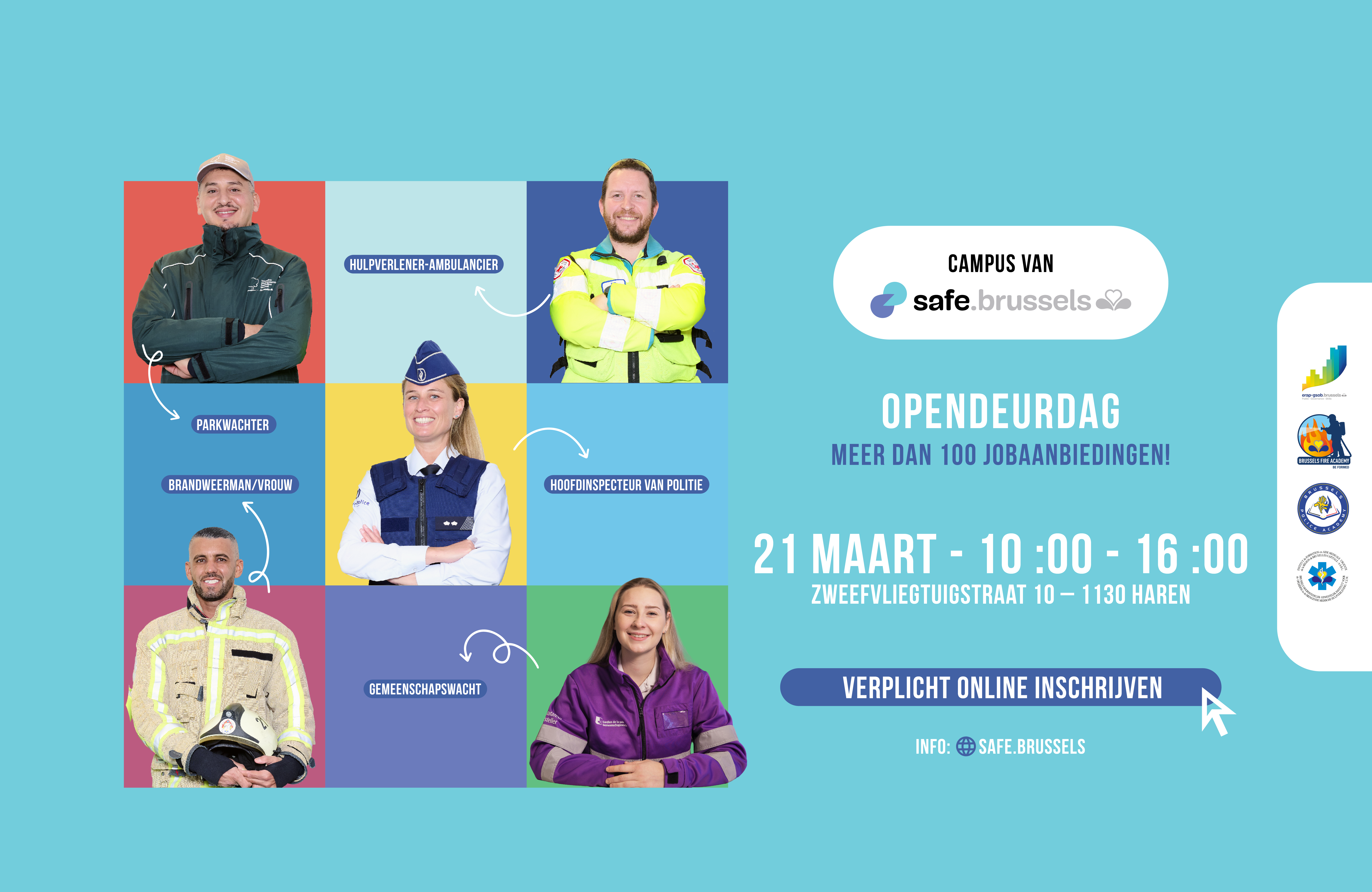 Op zaterdag 21 maart 2026, van 10.00 tot 16.00 uur, stelt de safe.brussels Campus haar deuren voor jou open, in samenwerking met haar vier partnerscholen (de Politieschool, de Brandweerschool, de School voor hulpverleners-ambulanciers en de School voor Openbaar Bestuur). Deze opendeurdag richt zich tot toekomstige talenten die geïnteresseerd zijn in de beroepen van preventie, veiligheid en crisisbeheer en die meer informatie willen, richting zoeken of een nieuwe wending aan hun job willen geven.