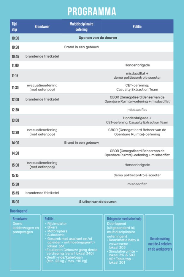 Een concrete, interactieve en inspirerende dag om je toekomst binnen de beroepen van veiligheid, preventie en crisisbeheer vorm te geven.